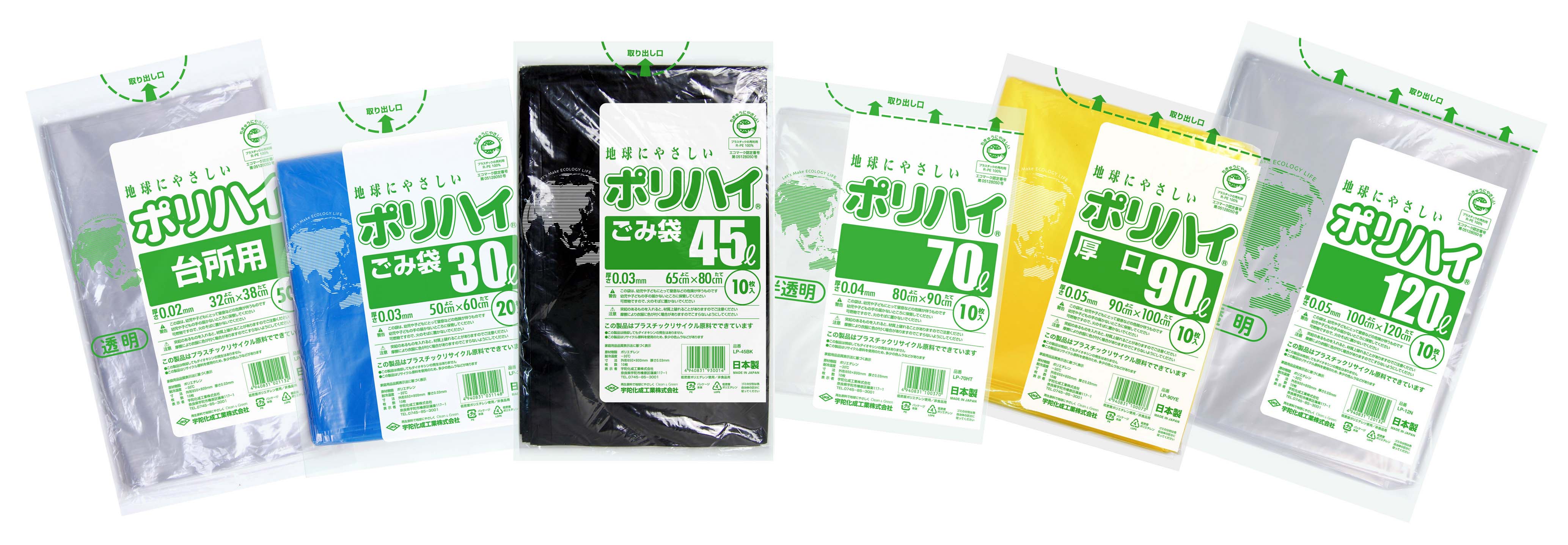 再生原料100%による規格袋「ポリハイ」ゴミ袋は“エコマーク”の認定を受けています。 |