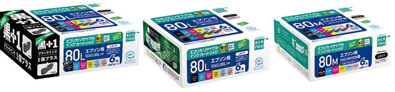 使用済みインクカートリッジを回収し再利用した商品です。カートリッジは再利用を行い独自開発のインクを充填しております。 ECI-E80L-6P、ECI-E80L6P+BK ECI-E80-6PM |