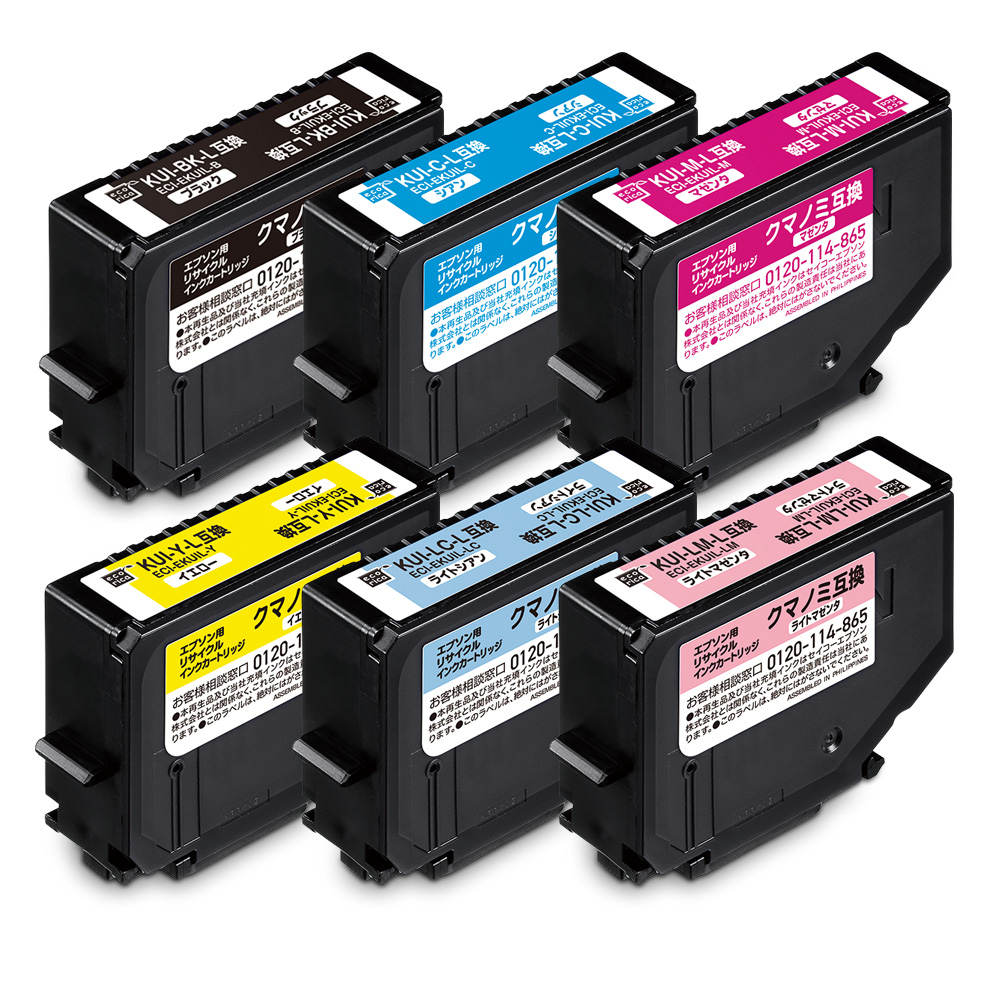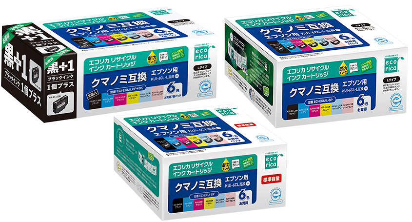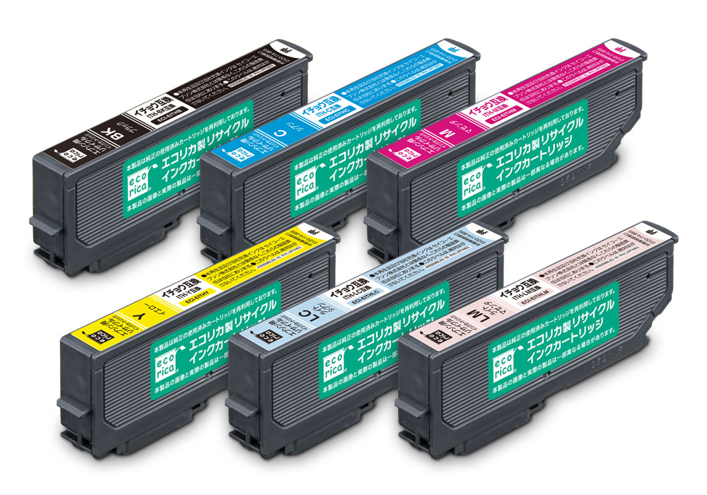 使用済みインクカートリッジを回収し再利用した商品です。カートリッジは再利用を行い独自開発のインクを充填しております。 ECI-EKUIL-6P、ECI-EKUIL6P+BK ECH-EKUIL-6P |