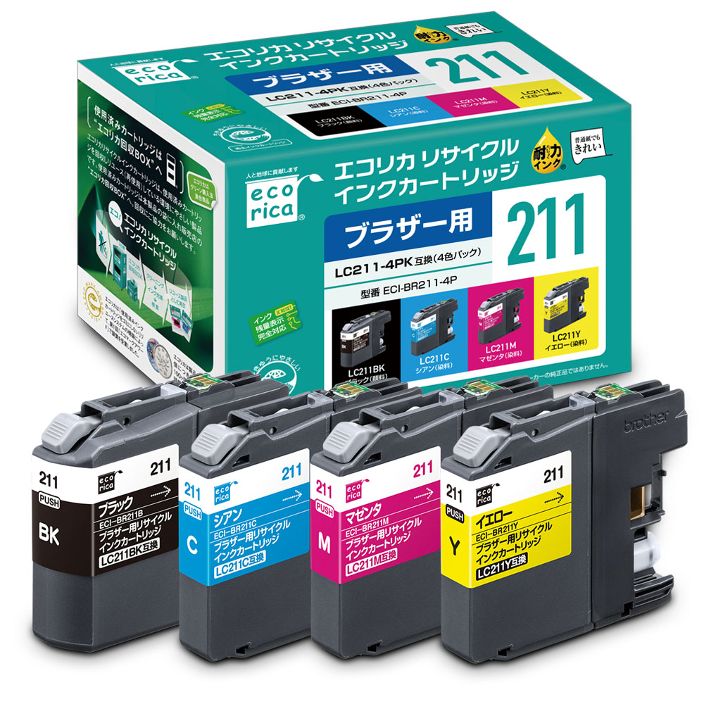 使用済みインクカートリッジを回収し再利用した商品です。カートリッジは再利用を行い独自開発のインクを充填しております。 ECI-BR211-4P ECH-BR211-4P ECI-BR211B、ECI-BR211C、ECI-BR211M、ECI-BR211Y、ECI-BR211B-2P ESP-BR211B、ESP-BR211C、ESP-BR211M、ESP-BR211Y |