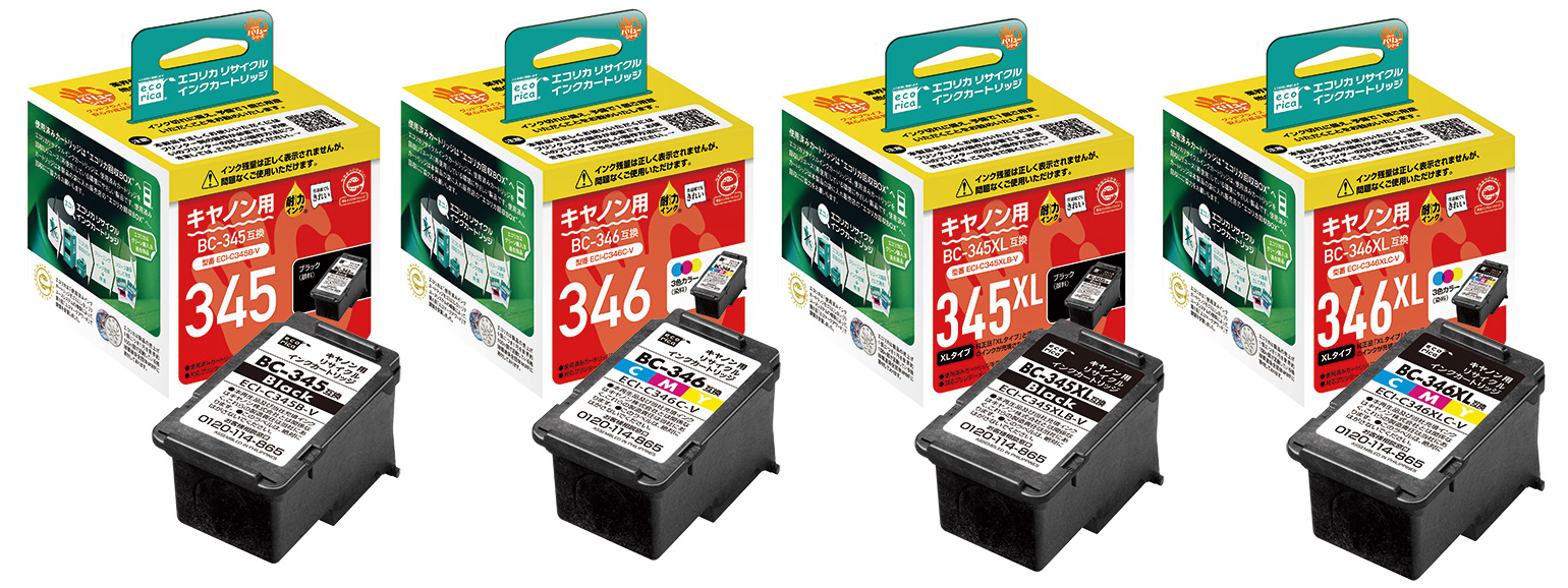 使用済みインクカートリッジを回収し再利用した商品です。カートリッジは再利用を行い独自開発のインクを充填しております。 ECI-C345B-V、ECI-C345XLB-V、ECI-C346C-V、ECI-C346XLC-V |