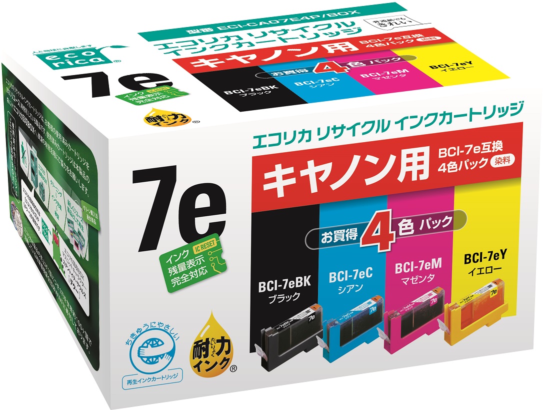 使用済みインクカートリッジを回収し再利用した商品です。カートリッジは再利用を行い独自開発のインクを充填しております。 ECI-CA07E4P/BOX |