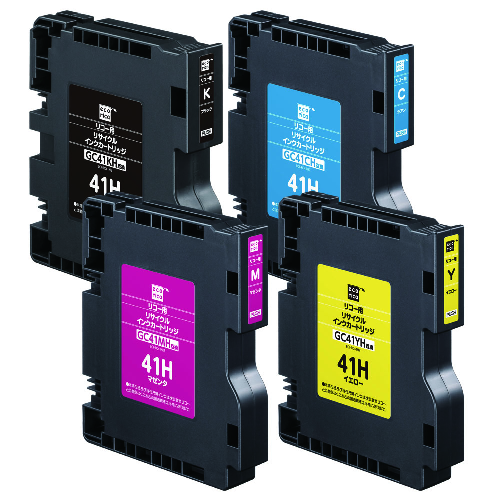 使用済みインクカートリッジを回収し再利用した商品です。カートリッジは再利用を行い独自開発のインクを充填しております。 ECI-RC41HB、ECI-RC41HC、ECI-RC41HM、ECI-RC41HY |