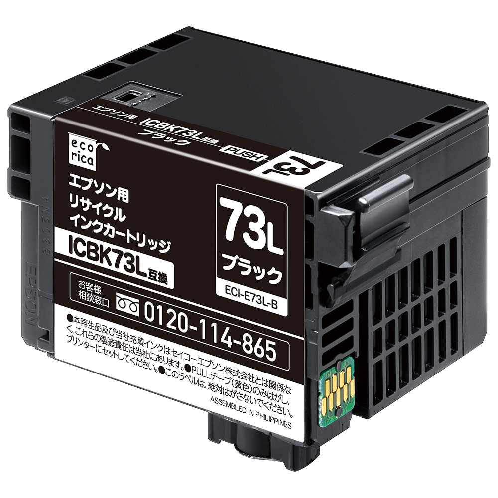 使用済みインクカートリッジを回収し再利用した商品です。カートリッジは再利用を行い独自開発のインクを充填しております。 ECI-E73L-B |