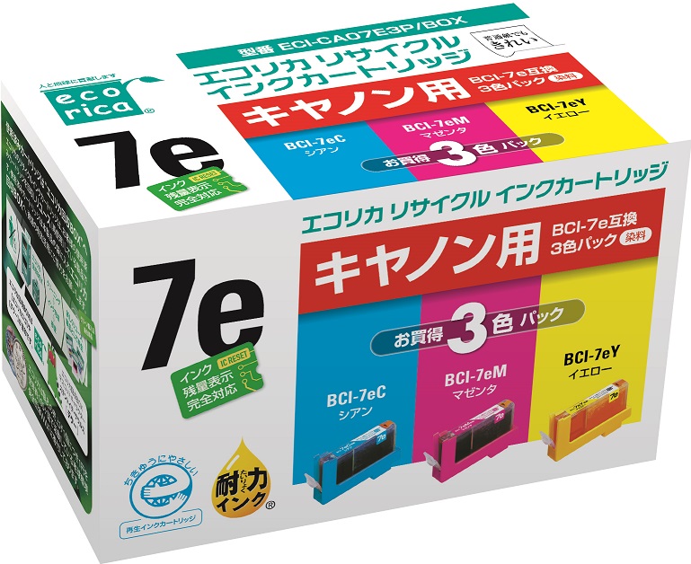 使用済みインクカートリッジを回収し再利用した商品です。カートリッジは再利用を行い独自開発のインクを充填しております。 ECI-CA07E3P/BOX |