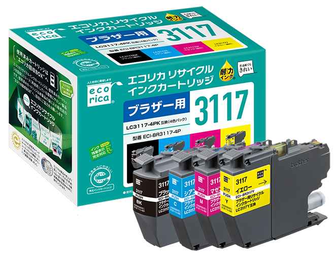 使用済みインクカートリッジを回収し再利用した商品です。カートリッジは再利用を行い独自開発のインクを充填しております。 ECI-BR3117-4P ECI-BR3117B、ECI-BR3117C、ECI-BR3117M、ECI-BR3117Y |