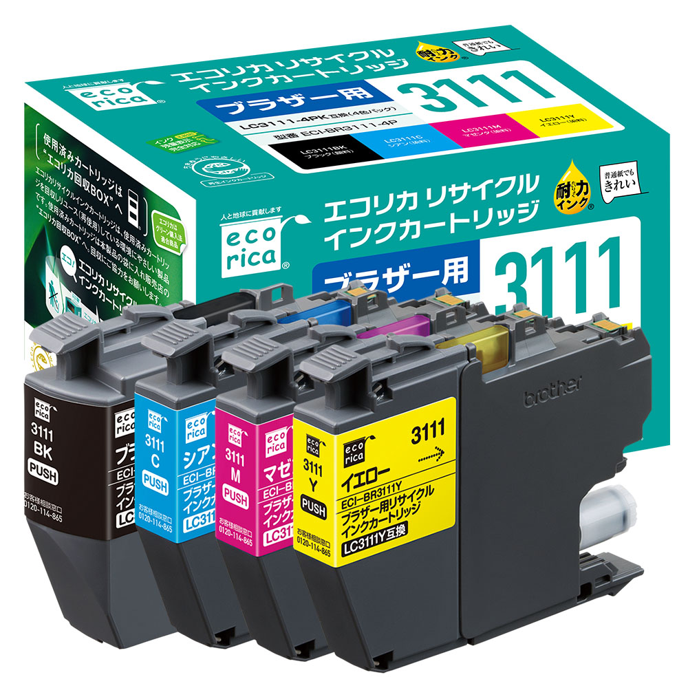 使用済みインクカートリッジを回収し再利用した商品です。カートリッジは再利用を行い独自開発のインクを充填しております。 ECI-BR3111-4P ECH-BR3111-4P ECI-BR3111B、ECI-BR3111C、ECI-BR3111M、ECI-BR3111Y、ECI-BR311B-2P ESP-BR3111B、ESP-BR3111C、ESP-BR3111M、ESP-BR3111Y |