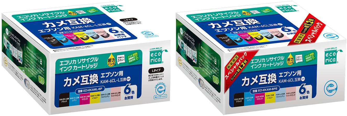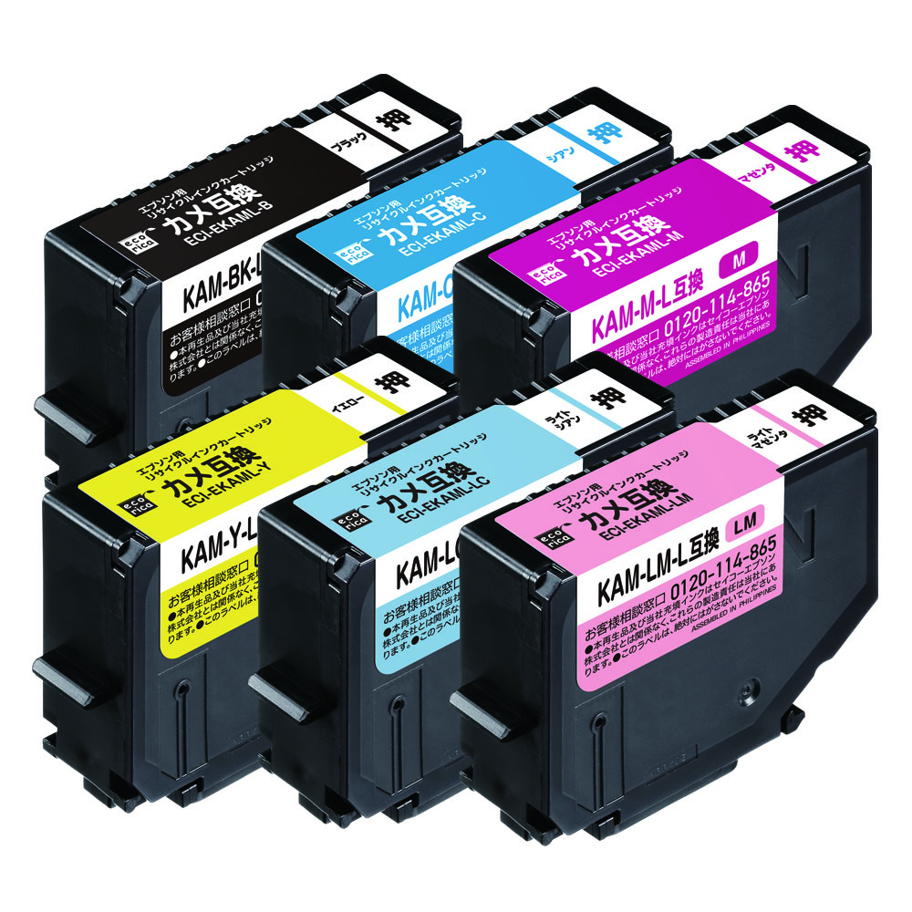 使用済みインクカートリッジを回収し再利用した商品です。カートリッジは再利用を行い独自開発のインクを充填しております。 ECI-EKAML-6P、ECI-EKAM-6PS ECH-EKAML-6P |