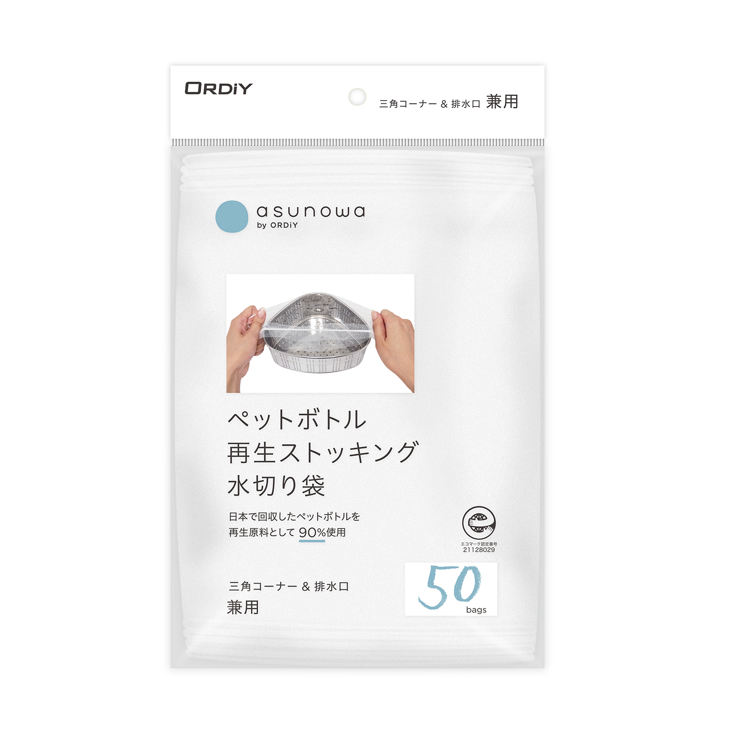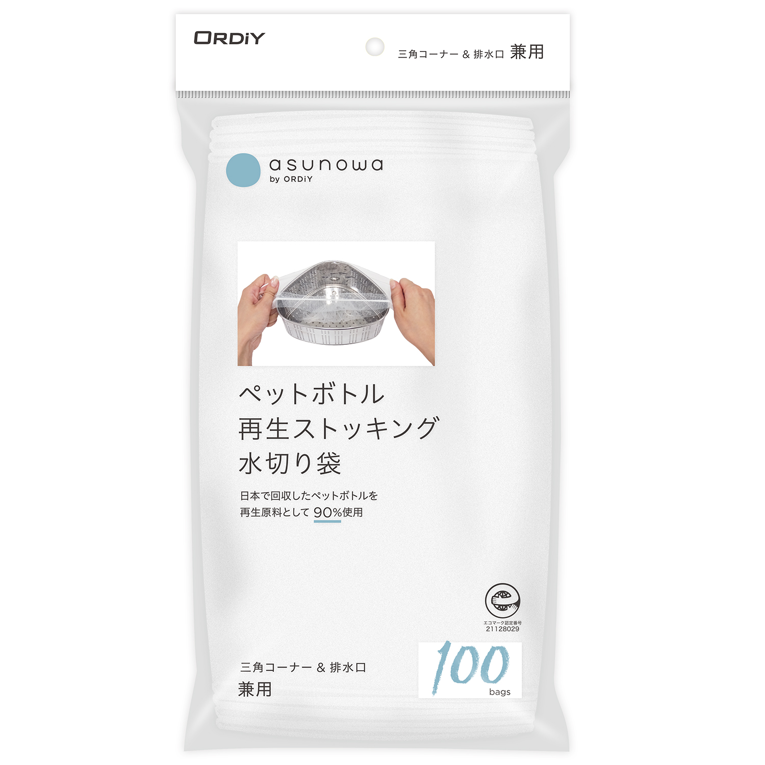 日本国内で回収されたペットボトルを再生原料として90%以上使用したストッキング水切り袋。 |