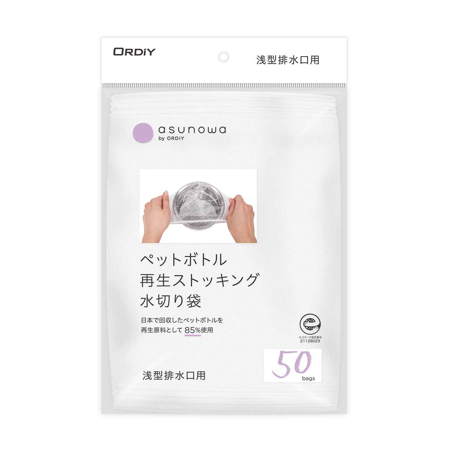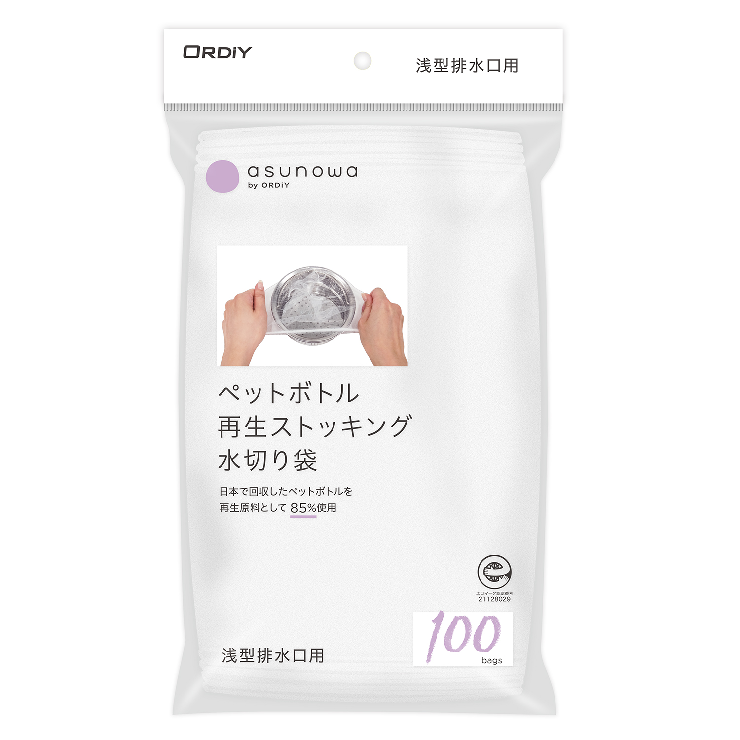 日本国内で回収されたペットボトルを再生原料として85%以上使用したストッキング水切り袋。 |