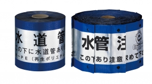 サンエコシートは原料に再生ポリエチレンを50%以上使用し、従来品と同等の品質を備えた環境に優しいエコマーク認定製品です。埋設管と地表の中間に敷設することにより、付近掘削作業時にまずシートが現われ埋設管の位置や種類を示して破損事故を未然に防ぐことができます。各種管路用に対応しており、各自治体、企業名等管理者名称を印刷表示した製品も製作いたします。 |