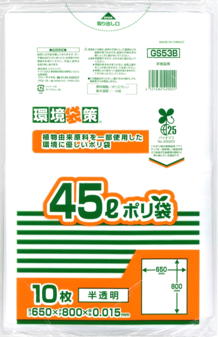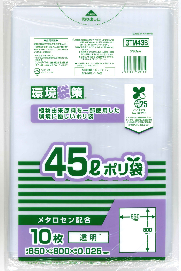 バイオマスマーク取得商品。植物由来原料を25%使用した環境にやさしいポリ袋。 |